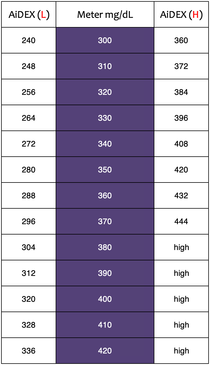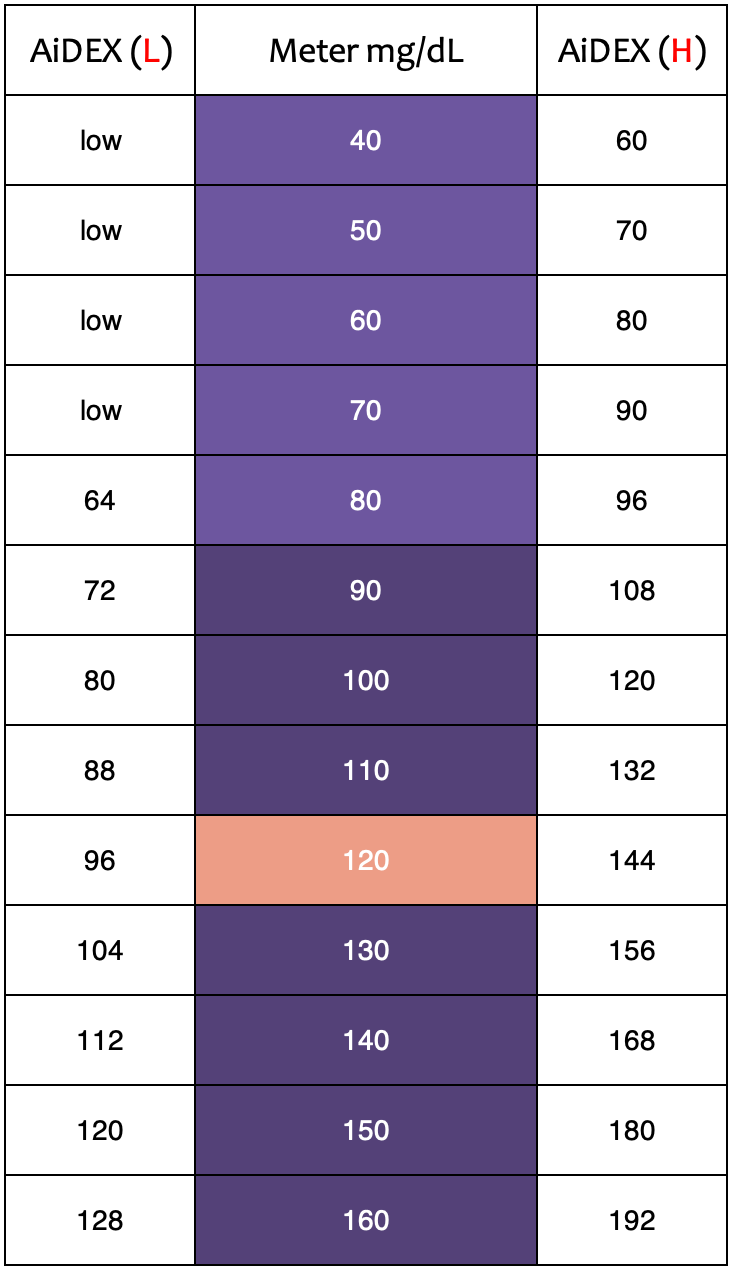في الدراسات السريرية ، تم قياس دقة أجهزة قياس السكر في الدم و آيديكس مقابل القيم المرجعية لمحلل YSI. لذلك ، يجب أن تكون قراءات آيديكس واجهزة الوخز متقاربة ، لكن ليست متطابقة تمامًا. يجب أن تكون النسبة المئوية لقيم المراقبة المستمرة للسكري دائمًا ضمن ± ٢٠٪ أو ± ٢٠ مجم / ديسيلتر من قيم نتائج طريقة المقارنة المختبرية (YSI).
